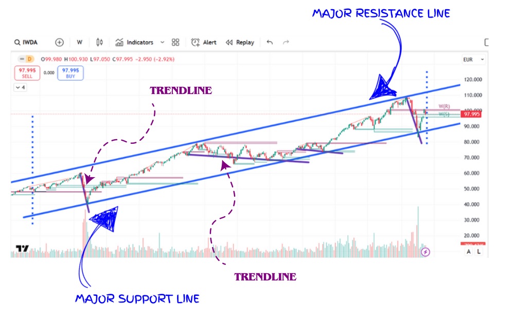 Major support lines are the jungle’s deepest valleys—places where the price, like a thirsty animal, comes to drink and rest. These levels have stopped the market’s fall many times over the years, acting as a strong “floor” where buyers gather their courage and push prices back up.